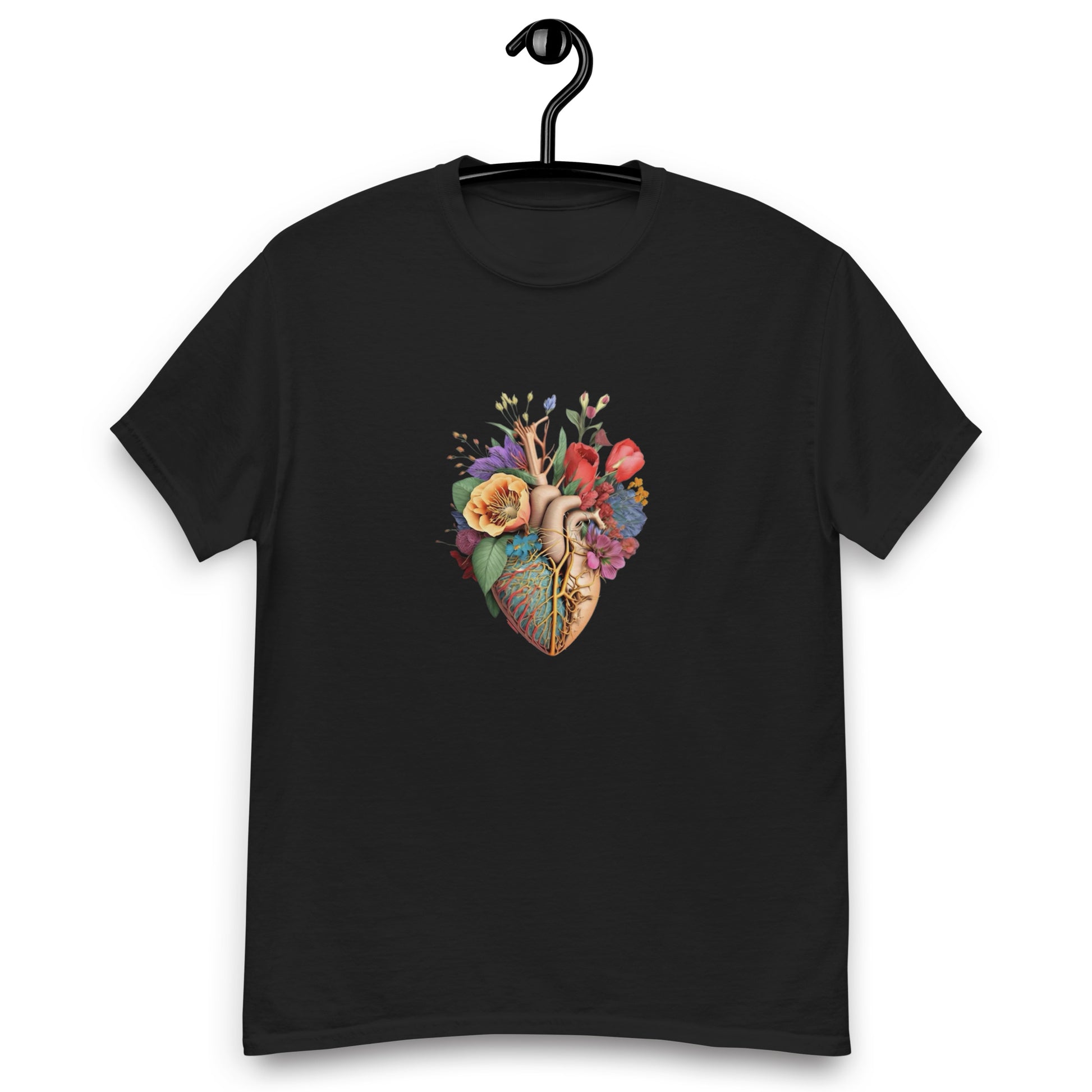 Die Vorderseite zeigt eine Herzillustration, die verschiedene Blumen integriert. Diese Darstellung verbindet anatomische und botanische Elemente in einer farbenfrohen und künstlerischen Weise.