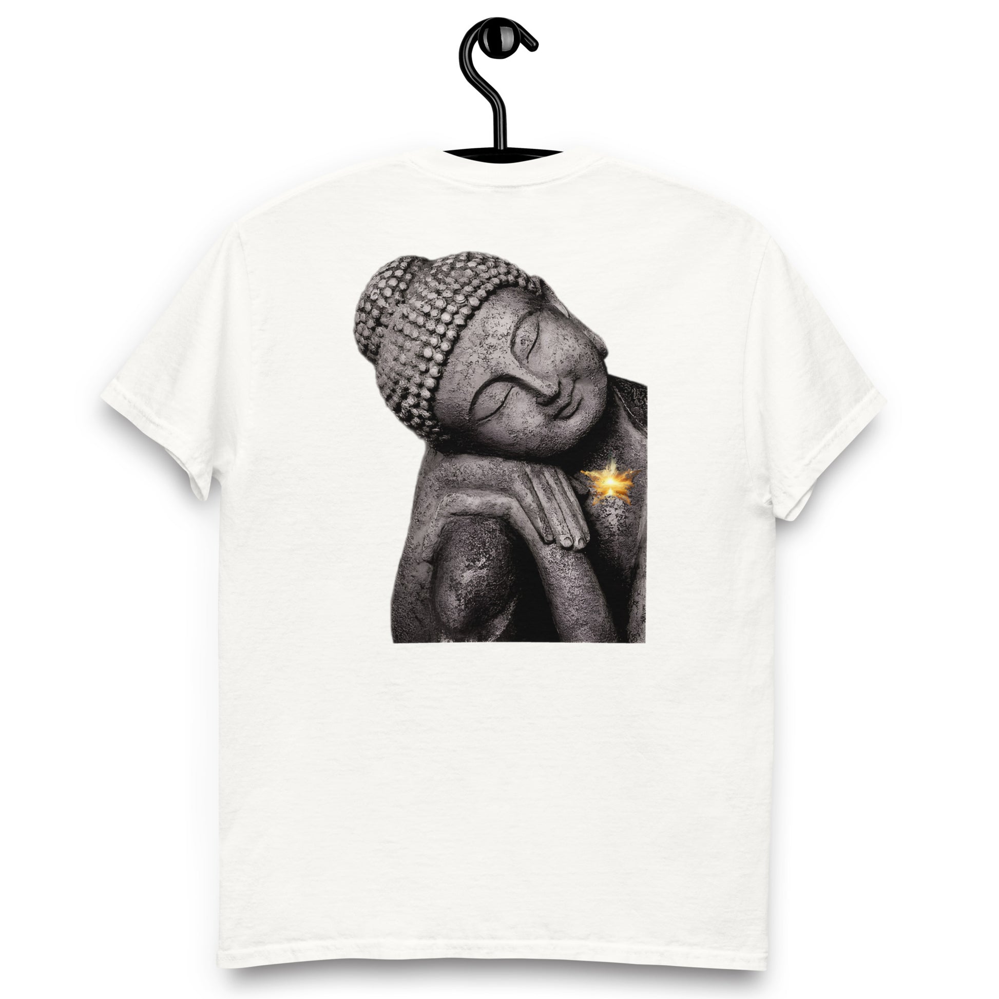 Die Rückseite zeigt eine ruhige Buddha-Statue in einer entspannten, kontemplativen Pose mit einem Goldenen Schimmer welcher aus dem Herzen der Statue scheint, was eine spirituelle und friedliche Aura verleiht.